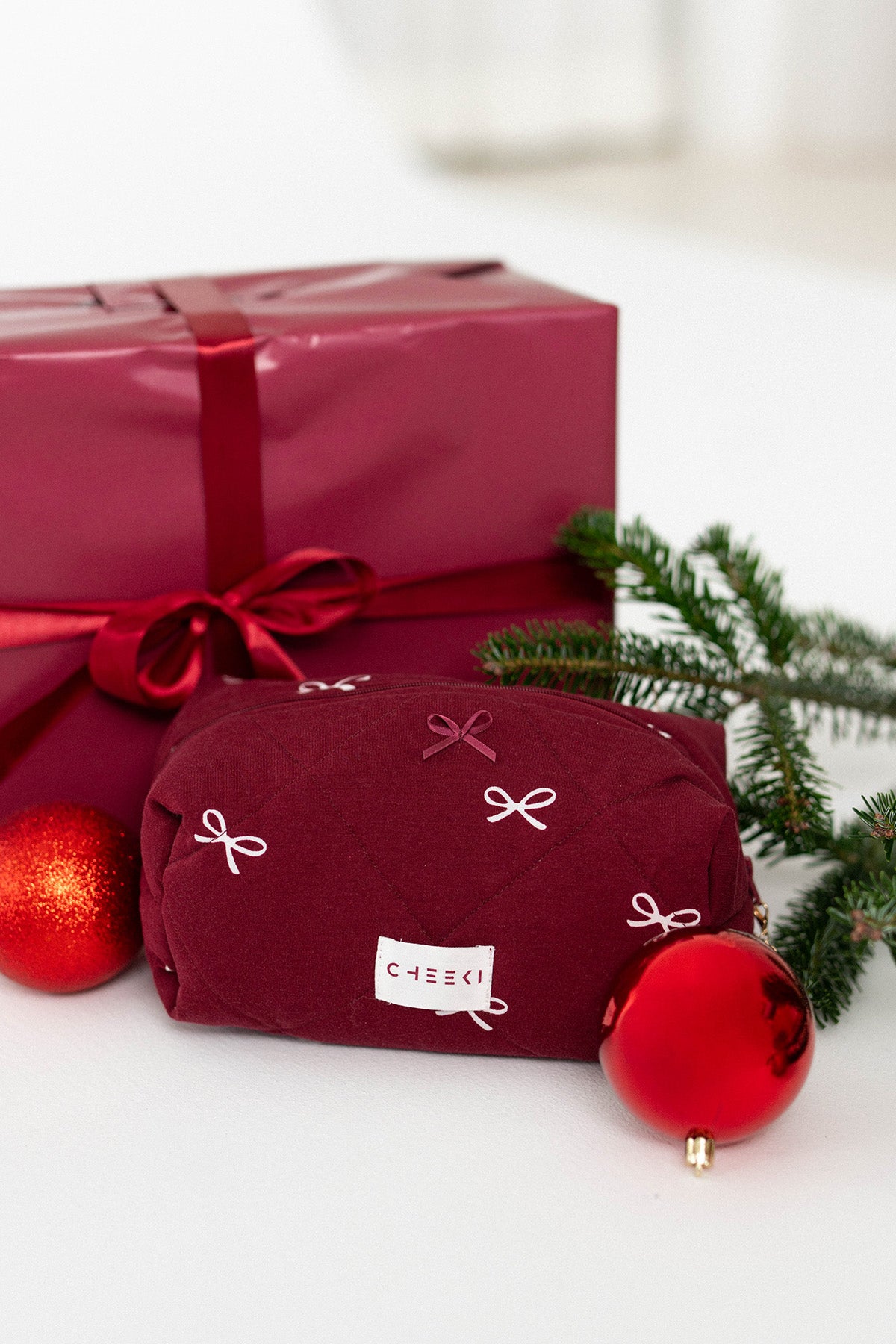 Unsere Kosmetiktasche mit Schleifen-Details in dunklem Rot – dein perfekter Begleiter für die festliche Jahreszeit. Die Kosmetiktasche ist ideal, um all deine Beauty-Essentials stilvoll zu verstauen – ob unterwegs oder zu Hause. Dank des praktischen Designs hast du deine Lieblingsprodukte immer griffbereit- ein Must-have für alle Beauty-Lover.
