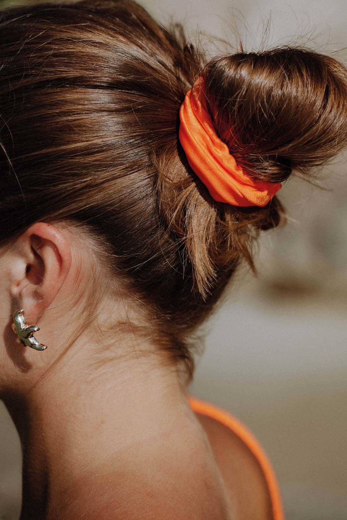 Verleihe deinem Hairstyle das gewisse Extra mit unserem Scrunchie Shiny Orange. Aus hochwertigem Material bietet er sanften und optimalen Halt. Passend zu unserem Bikini Shiny Orange.