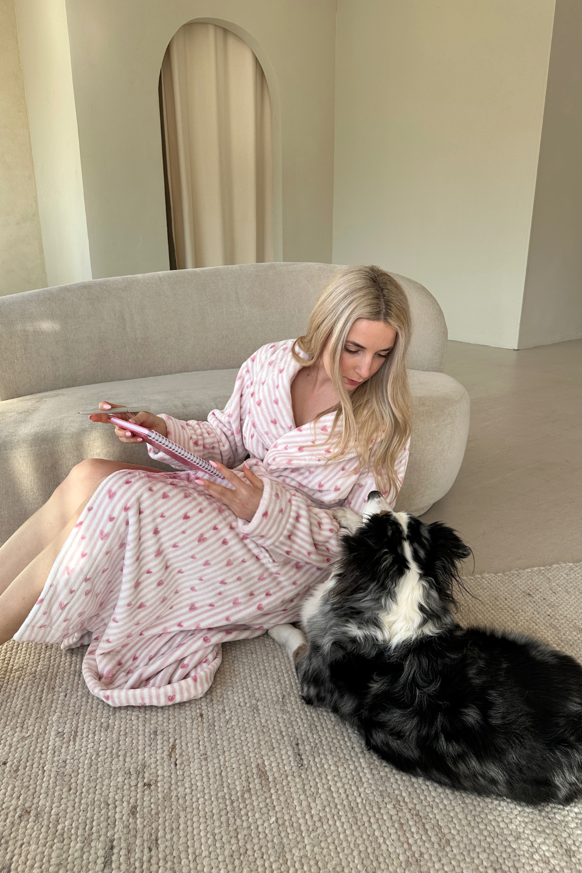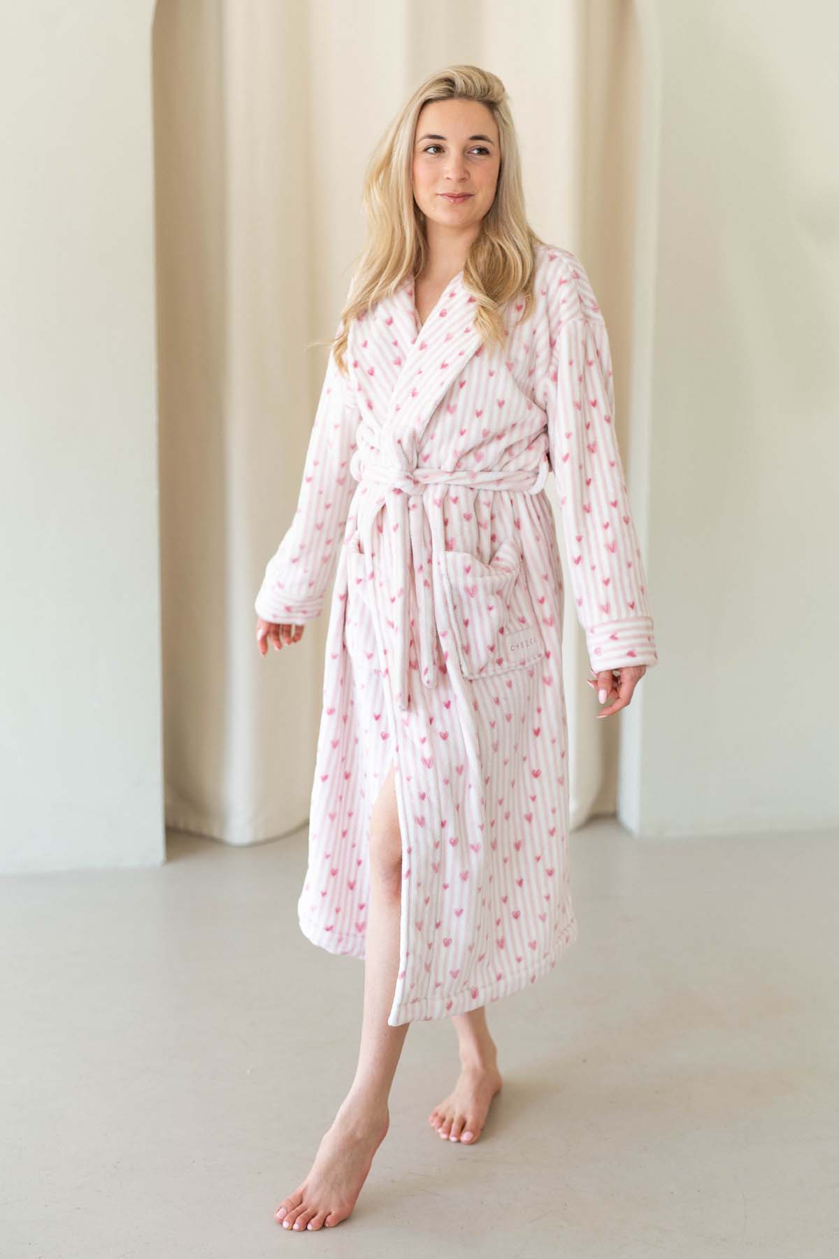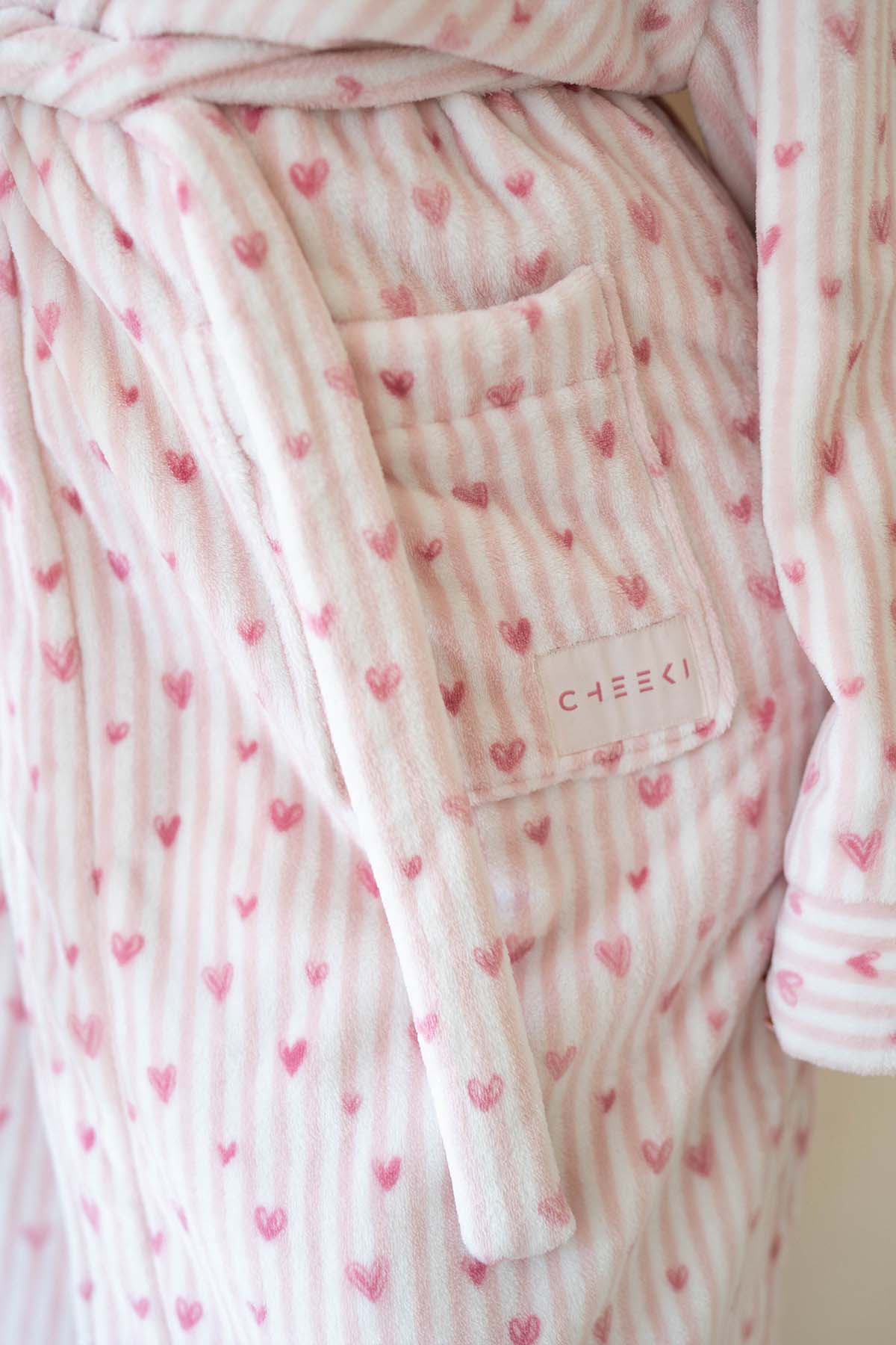 Unser Bademantel Hearts aus der Valentinstag-Kollektion ist der Inbegriff von Komfort und Romantik. Die niedlichen Herz-Details verleihen dem Bademantel eine liebevolle Note, während der weiche Stoff für ein kuscheliges Tragegefühl sorgt. Perfekt für entspannte Tage zu Hause oder als romantisches Geschenk für den Valentinstag – dieser Bademantel bringt Gemütlichkeit und Liebe in deinen Alltag!
