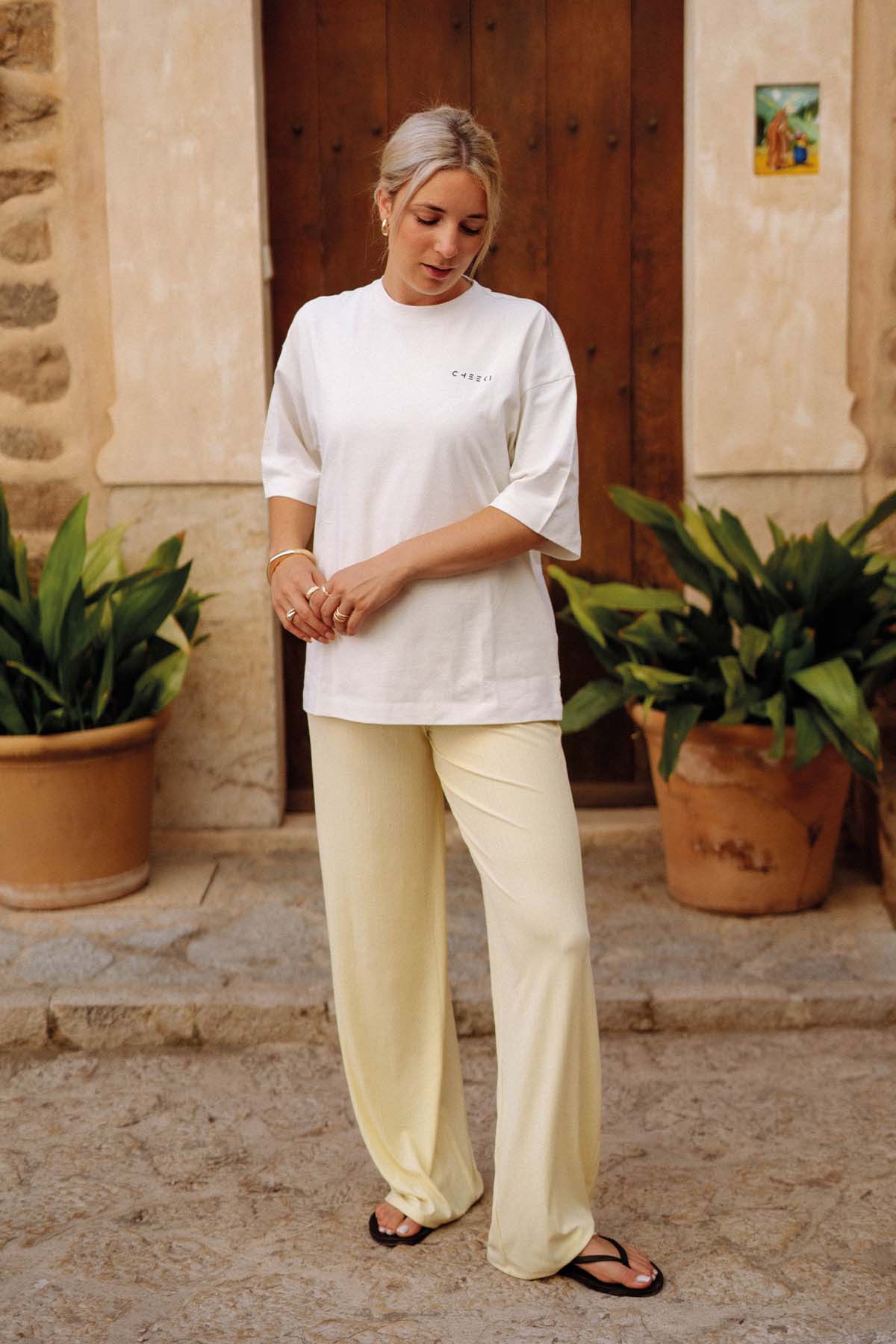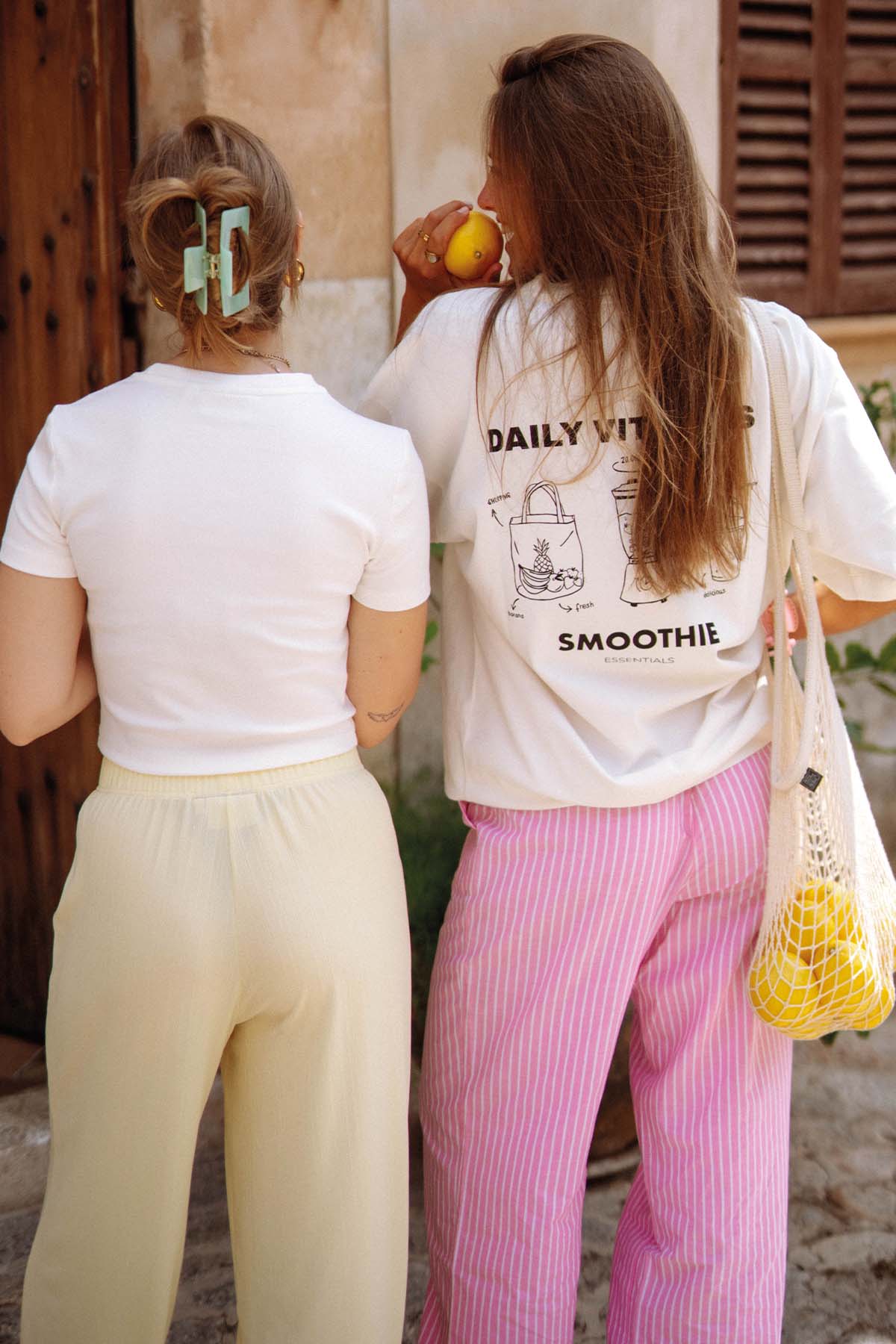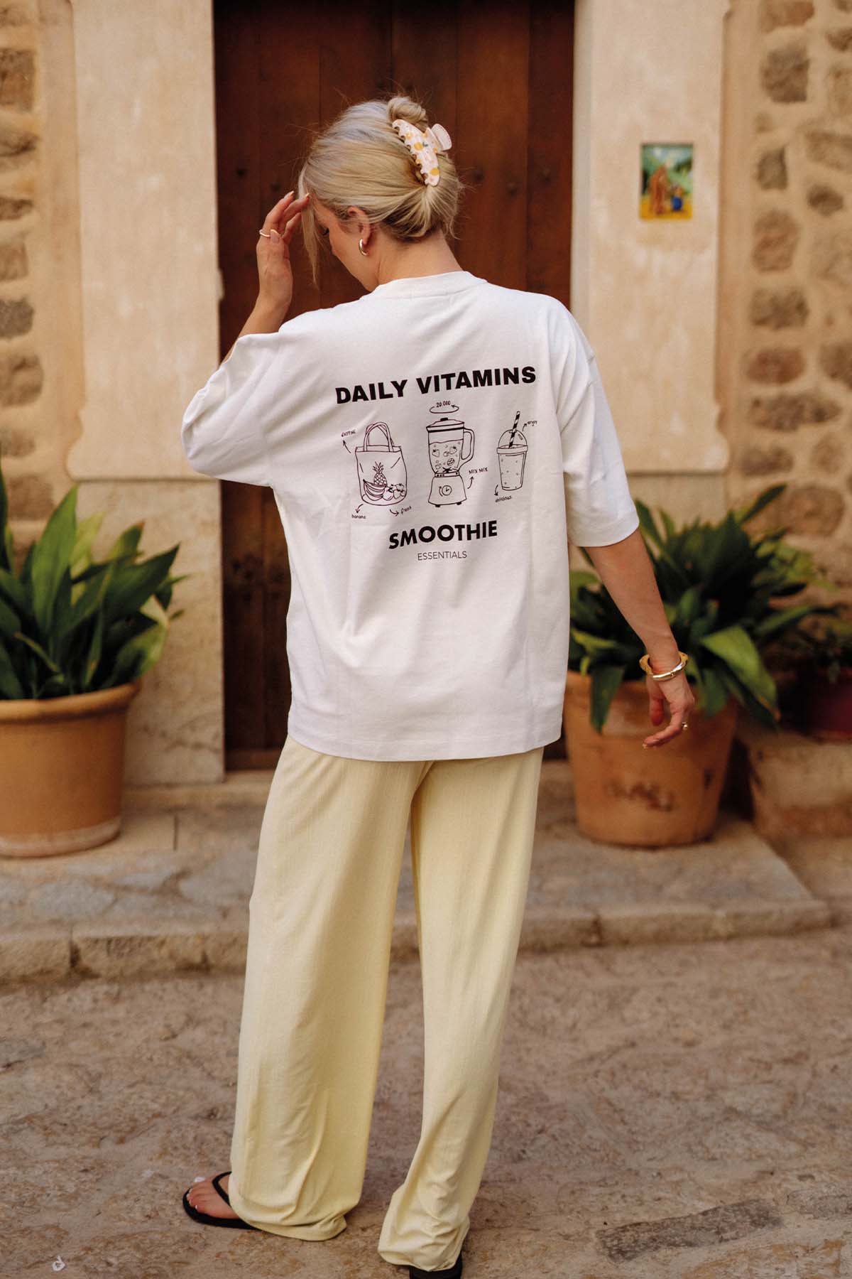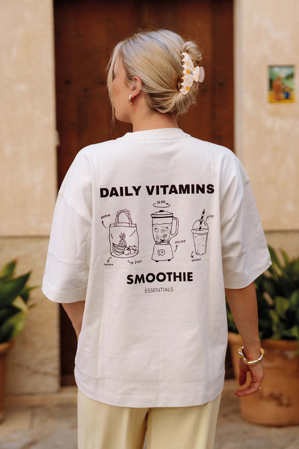 Aus 100 % Baumwolle gefertigt und mit einem lässigen Oversized Fit bietet dir unser Signature T-Shirt Smoothie Essentials den ganzen Tag über ein angenehmes Tragegefühl. Der coole Backprint mit handgezeichneten Illustrationen bringt sommerliche Vibes direkt in deinen Style. Nachhaltig produziert und vielseitig kombinierbar ist dieses T-Shirt dein neues Everyday-Essential – easy zu stylen, easy zu lieben.