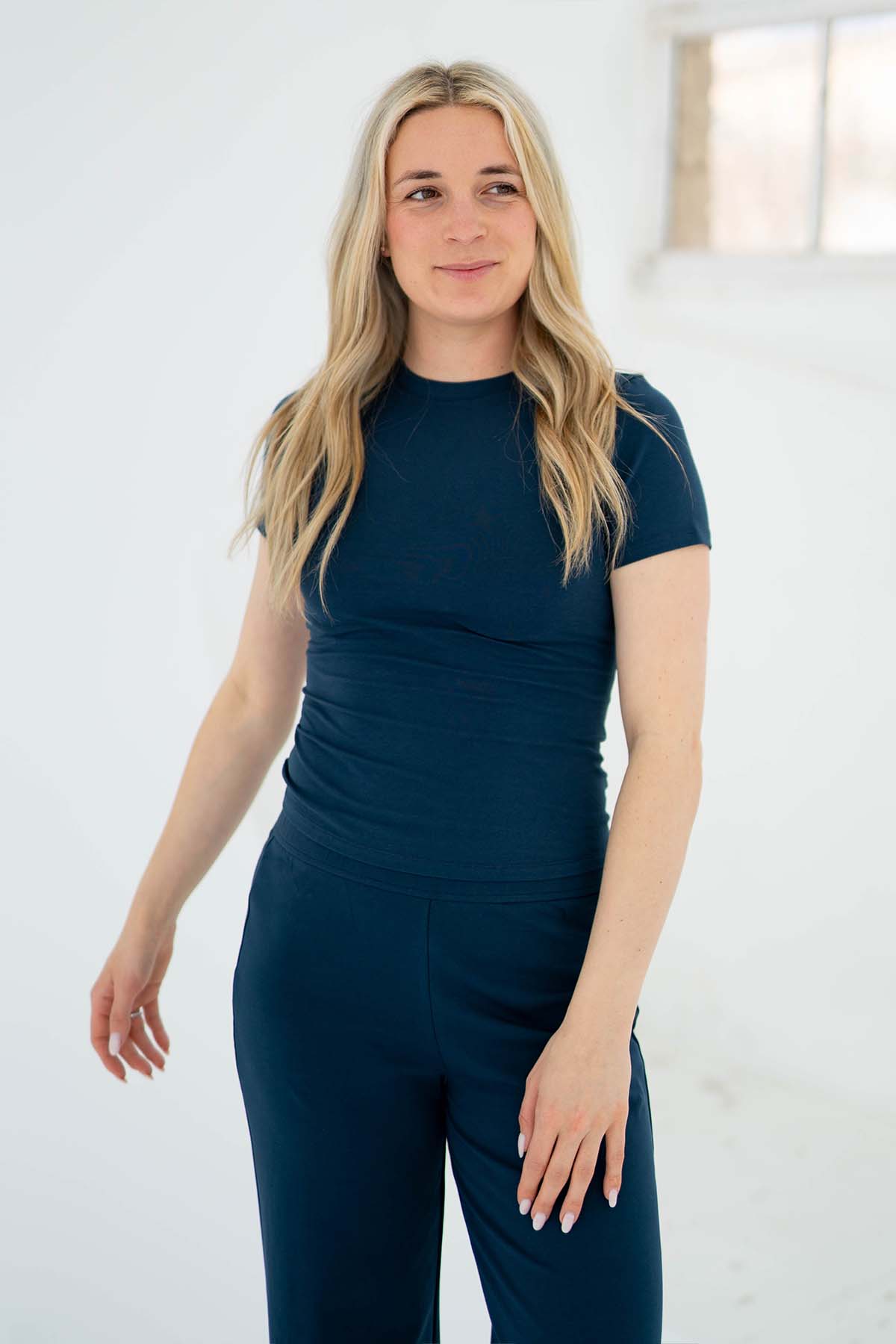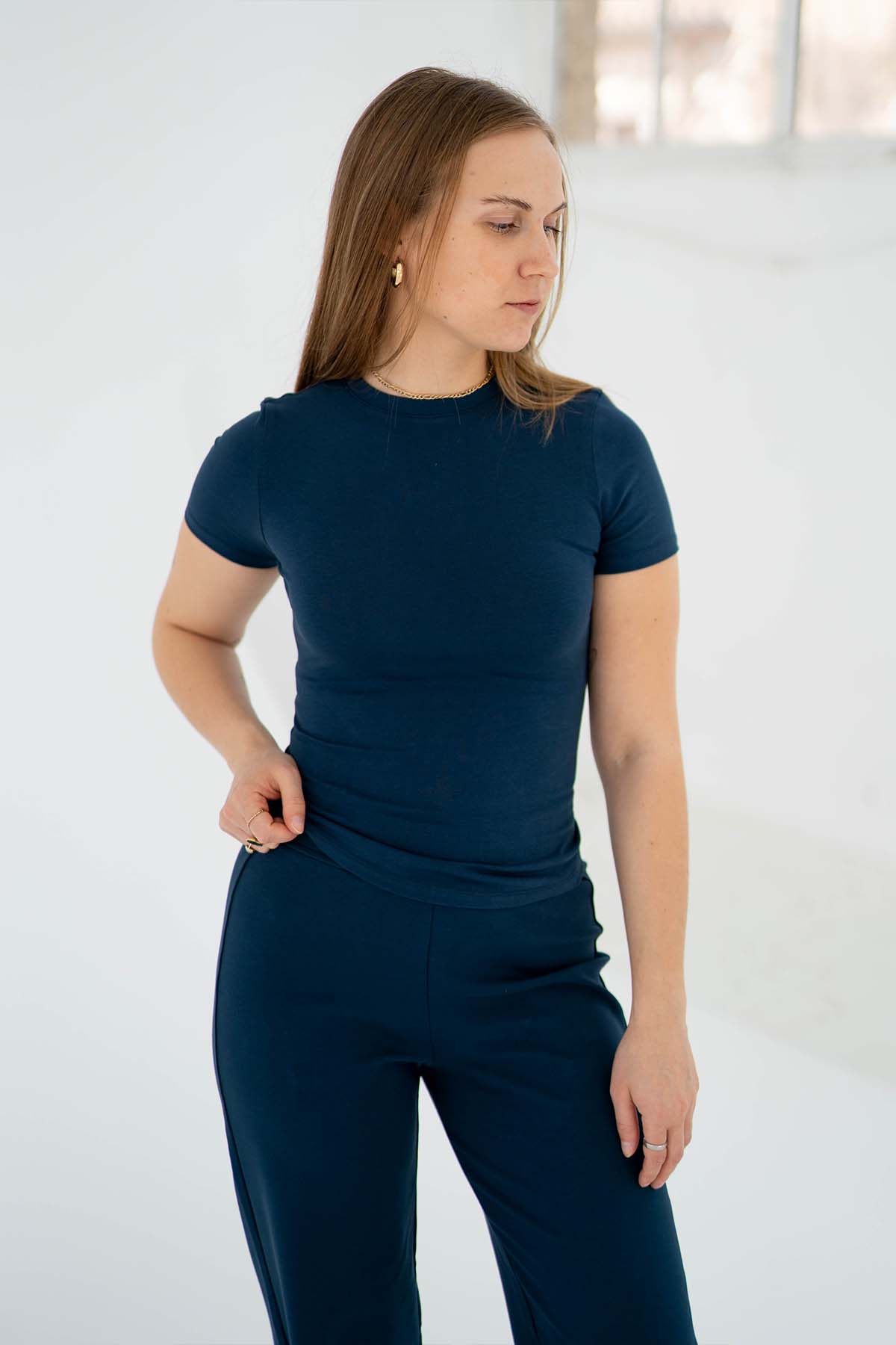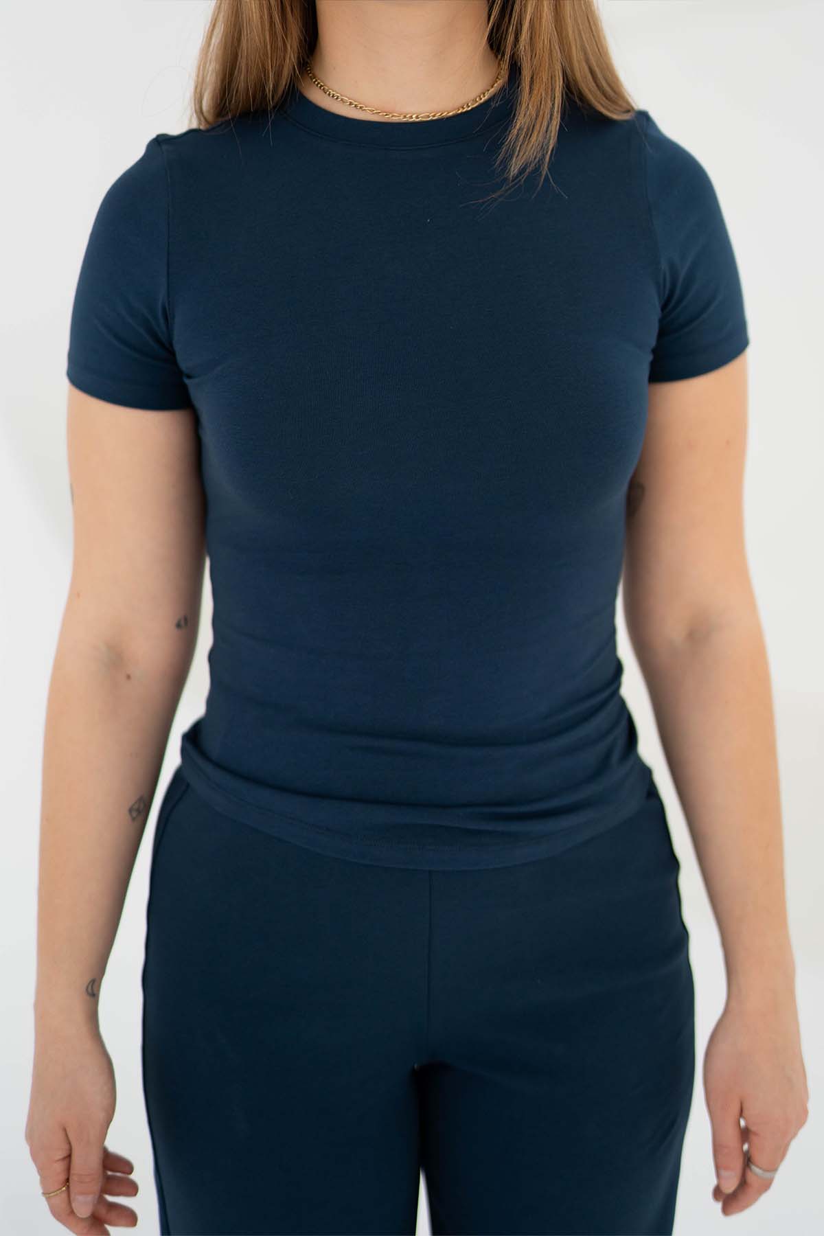 Unser T-Shirt in der Farbe Navy mit rundem Halsausschnitt ist das perfekte Basic Oberteil für deine Capsule Wardrobe, das Style und Komfort vereint. Das T-Shirt besteht aus 95% Bio-Baumwolle und bietet ein angenehmes Tragegefühl.