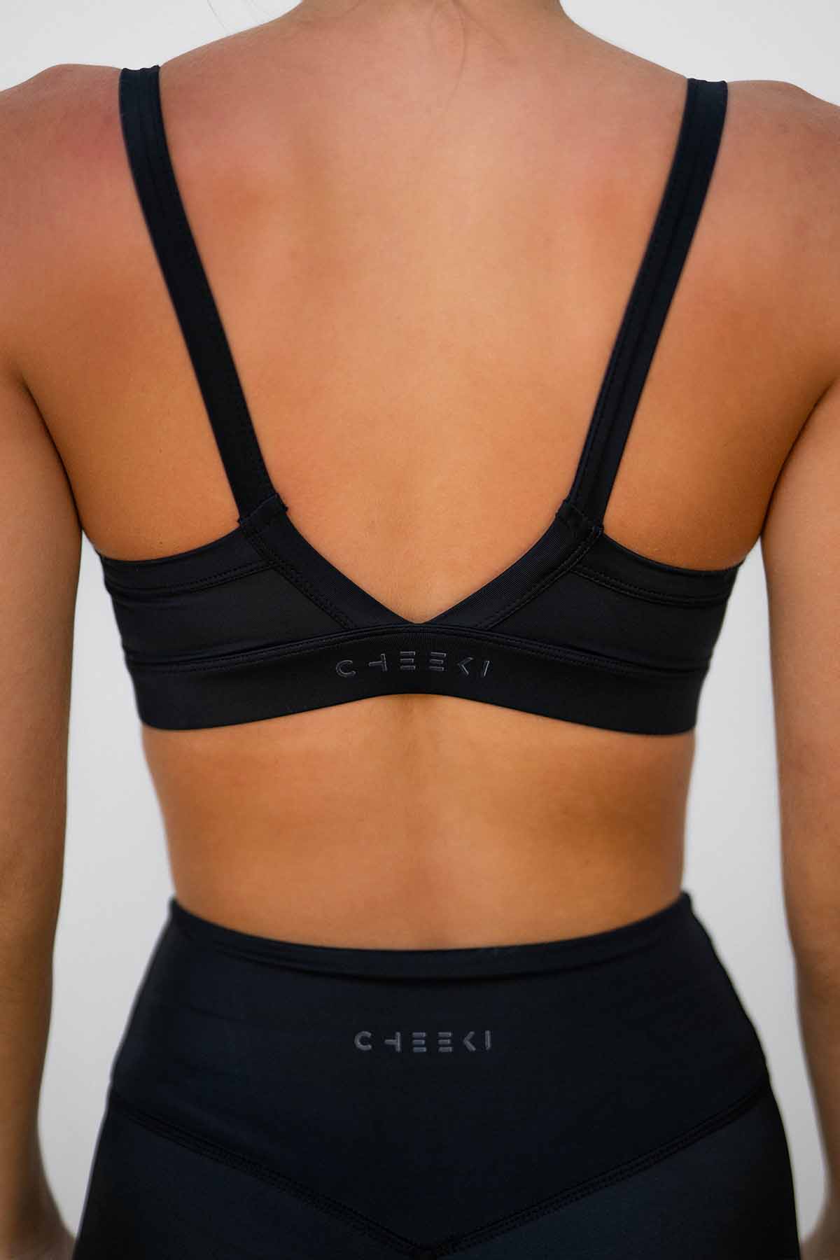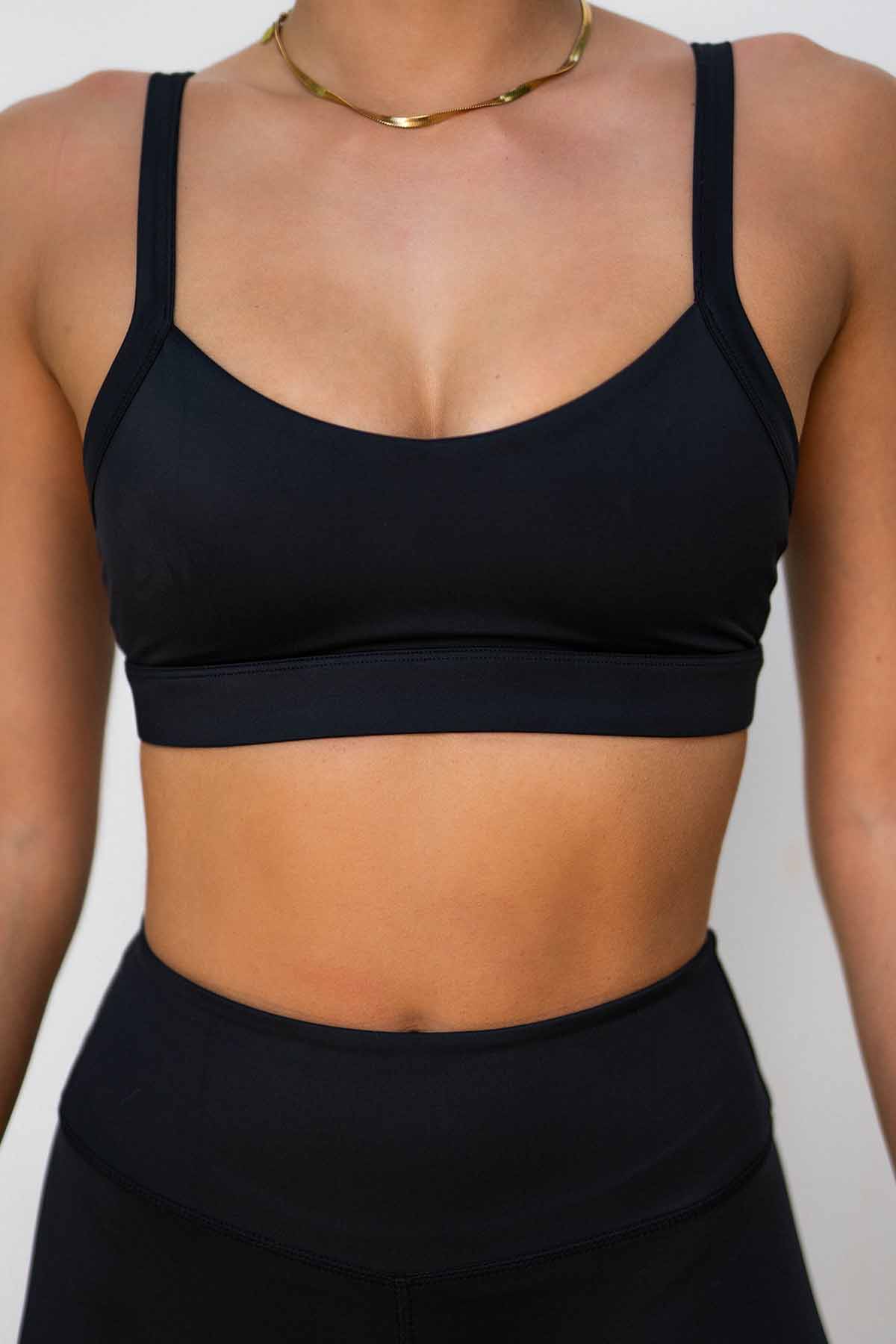 Sport Top ohne Padding mit schmalen Trägern, elastischem Bund und tiefem Rückenausschnitt. Hergestellt aus recyceltem Ozean Plastik.