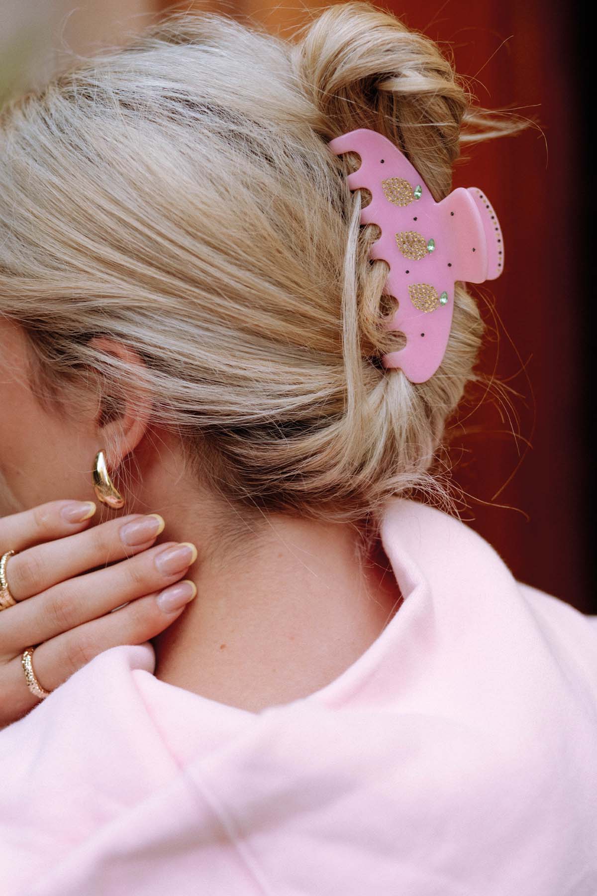 Unsere Statement Haarklammer Lemons mit kleinen Zitronen-Details und Glitzersteinchen. Die mittelgroße Haarklammer eignet sich toll für halb offene Frisuren. Je nach Haarlänge eignet sich die Haarspange aber auch super für Hochsteckfrisuren.