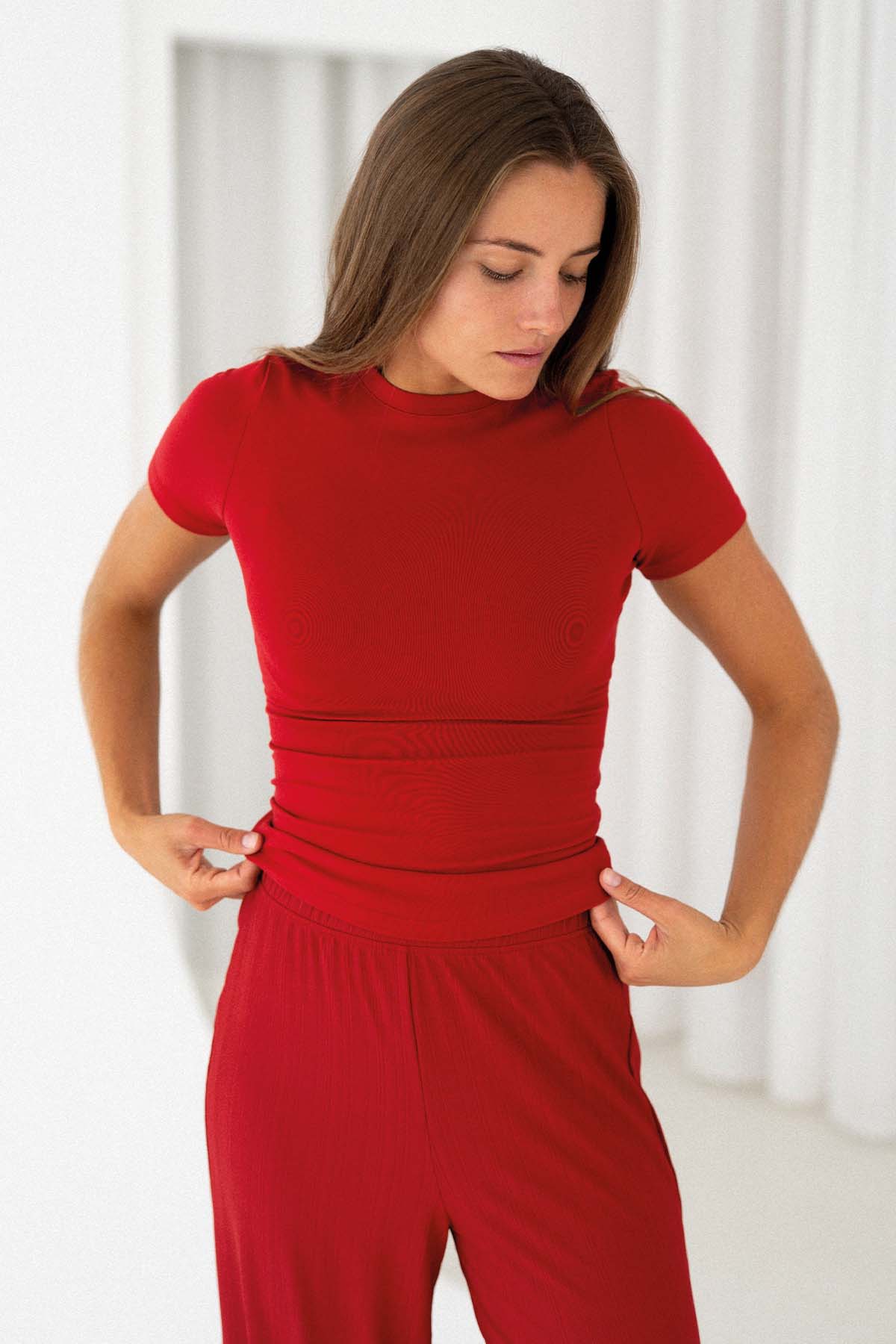 Unser T-Shirt in der Farbe Cherry Red mit rundem Halsausschnitt ist das perfekte Basic Oberteil für deine Capsule Wardrobe, das Style und Komfort vereint. Durch den hohen Baumwollanteil bietet das T-Shirt ein angenehmes Tragegefühl.